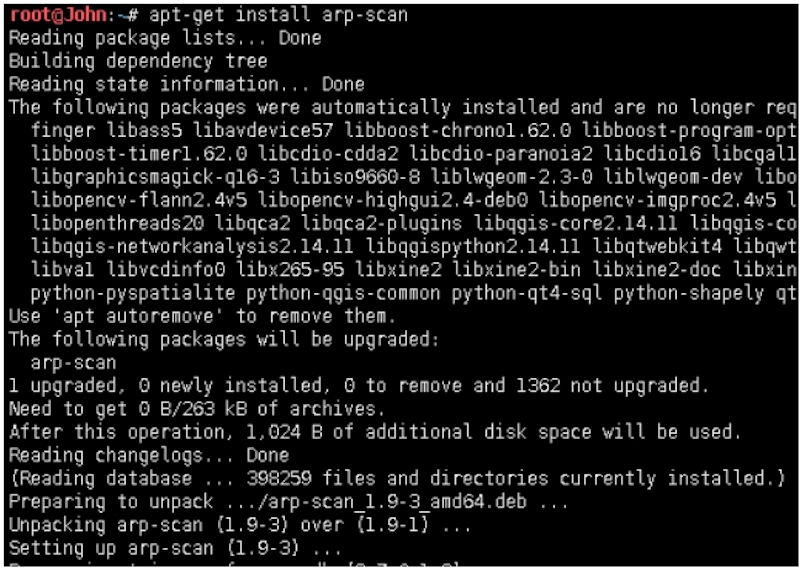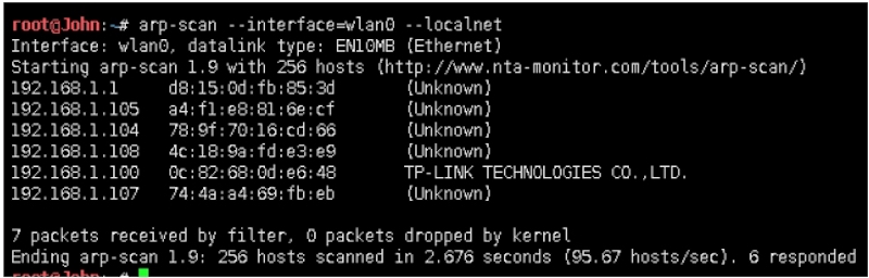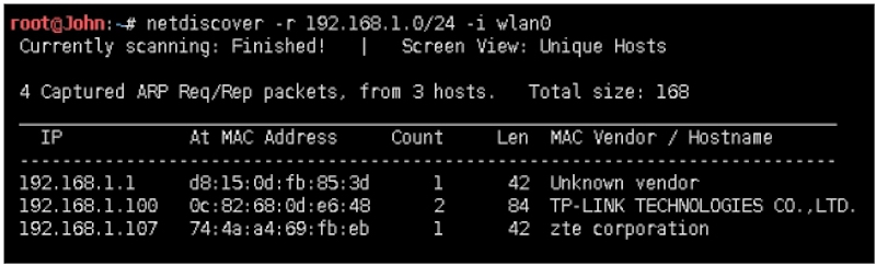 root@John:~# netdiscover -r 192.168.1.0/24 -i wlan0