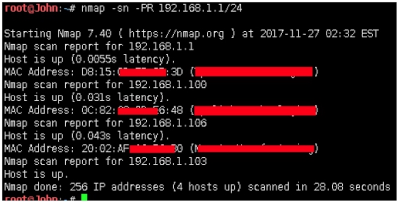 root@John:~# nmap -sn -PR 192.168.1.1/24