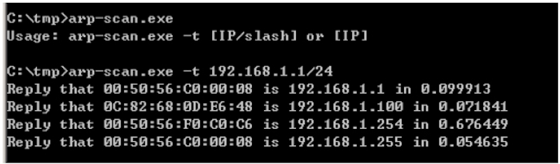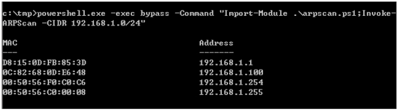 c:\tmp>powershell.exe -exec bypass -Command "Import-Module .\arpscan.ps1;Invoke-ARPScan -CIDR 192.168.1.0/24"