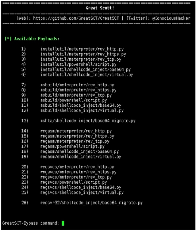 GreatSCT 是以 metasploit payload 为核心,白名单辅助 payload 执行框架。