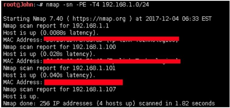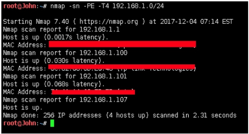 root@John:~# nmap ‐sn ‐PE ‐T4 192.168.1.0/24