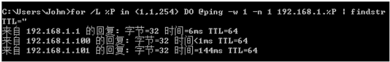 for /L %P in (1,1,254) DO @ping ‐w 1 ‐n 1 192.168.1.%P | findstr "TTL ="