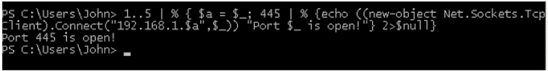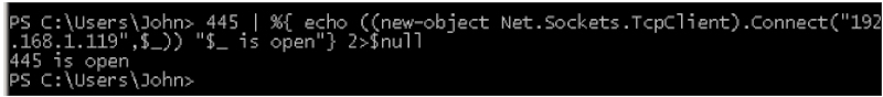 445 | %{ echo ((new‐object Net.Sockets.TcpClient).Connect("192.168.1.1