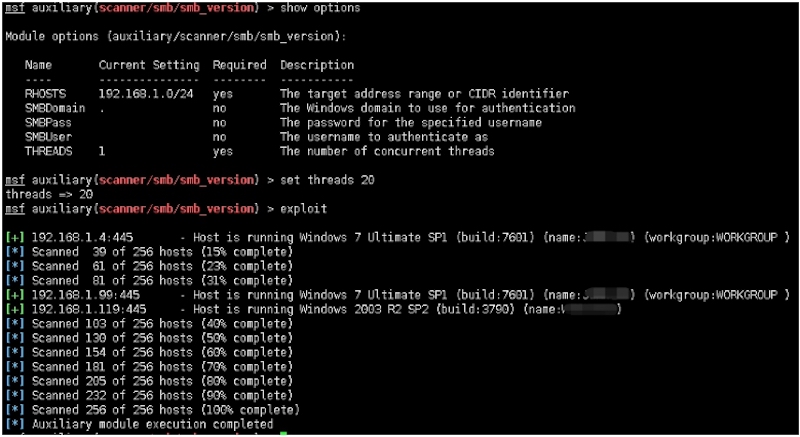 [+] 192.168.1.99:445 ‐ Host is running Windows 7 Ultimate SP1 (build:7601) (name:XXXXXX) (workgroup:WORKGROUP )