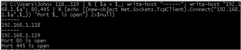 "192.168.1.$a"; 80,445 | % {echo ((new‐object Net.Sockets.TcpClient).Conn