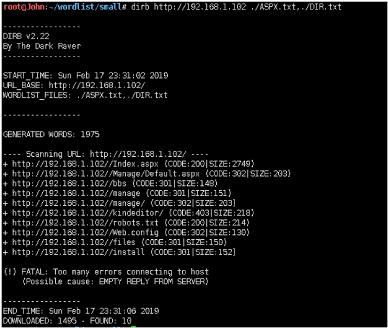 root@John:~/wordlist/small# dirb http://192.168.1.102 ./ASPX.txt,./DIR.txt