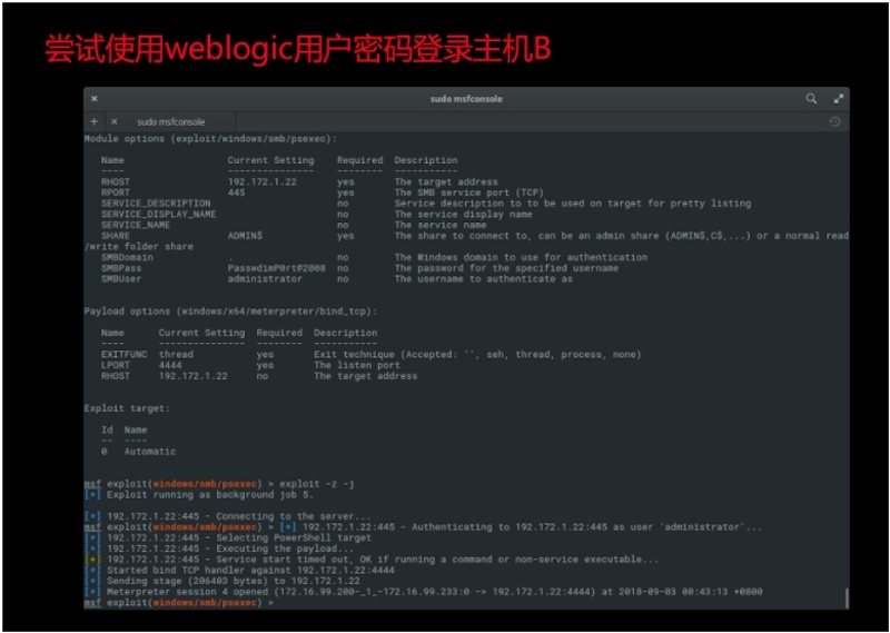 尝试做二级跳板,以weblogic相关配置,尝试对B(域内成员)的渗透(SMB)