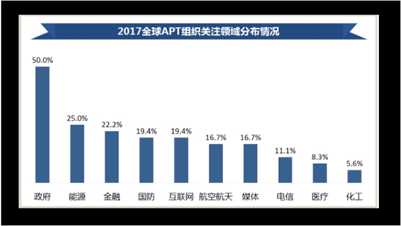 还有一点值得注意:APT组织的攻击虽然具有很强的针对性,但其攻击目标也并不一定是单一的。有的APT组织只攻击特定国家特定领域的目标(仅从目前已经披露的情况看),但也有很多APT组织会对多个国家的不同领域目标展开攻击。上图给出了2017年全球各国研究机构发布的APT研究报告中,披露APT组织攻击目标的所属国家、领域数量分析。