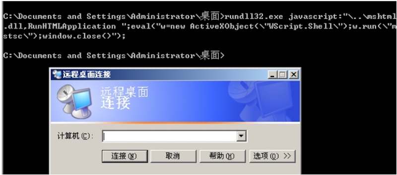 rundll32.exe javascript:"\..\mshtml.dll,RunHTMLApplication ";eval("w=new ActiveXObject(\"WScript.Shell\");w.run(\"mstsc\");window.close()");