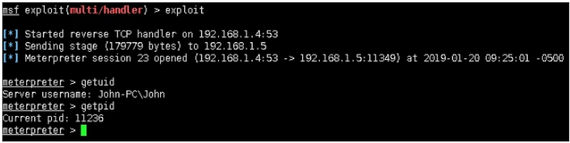 [*] Meterpreter session 23 opened (192.168.1.4:53 ‐> 192.168.1.5:11349)