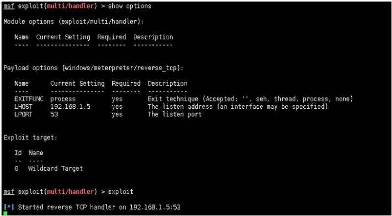 [*] Started reverse TCP handler on 192.168.1.5:53
