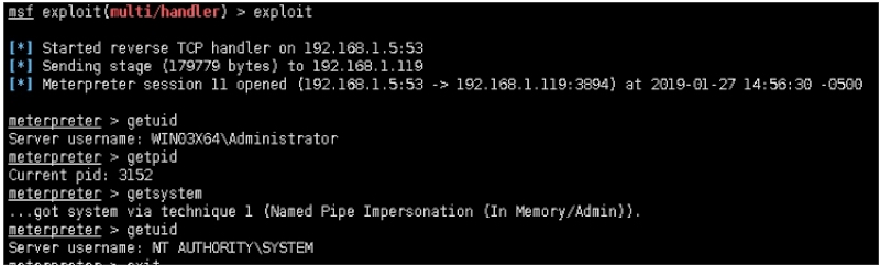 [*] Meterpreter session 4 opened (192.168.1.5:53 ‐> 192.168.1.119:3887) at 2019‐01‐27 14:30:27 ‐0500