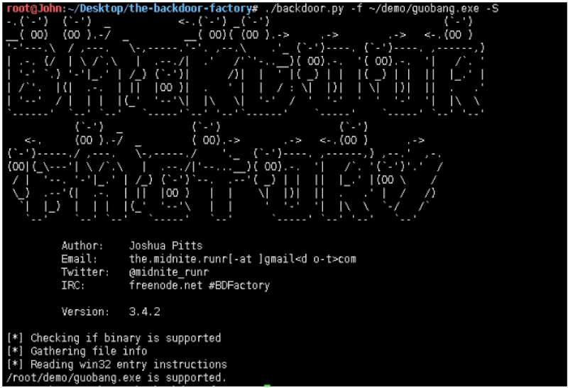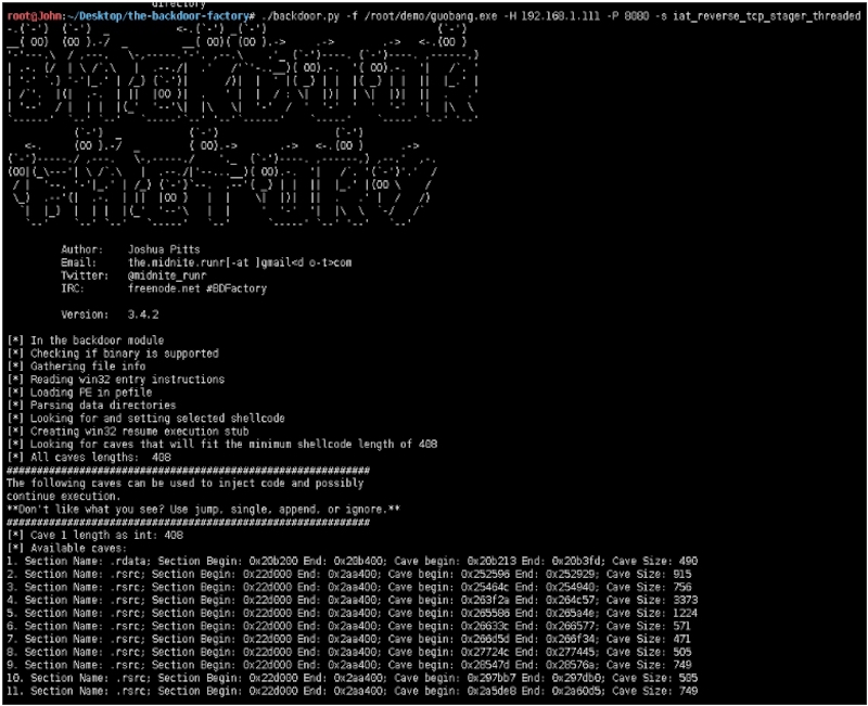 root@John:~/Desktop/the-backdoor-factory# ./backdoor.py -f ~/demo/guobang.exe -S