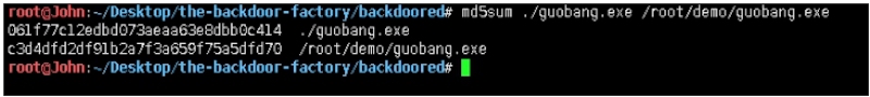 root@John:~/Desktop/the-backdoor-factory# md5sum ./guobang.exe /root/demo/guobang.exe