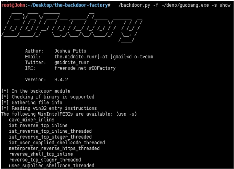 root@John:~/Desktop/the-backdoor-factory# ./backdoor.py -f ~/demo/guobang.exe -s show