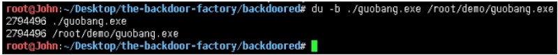 root@John:~/Desktop/the-backdoor-factory# du -k ./guobang.exe /root/demo/guobang.exe